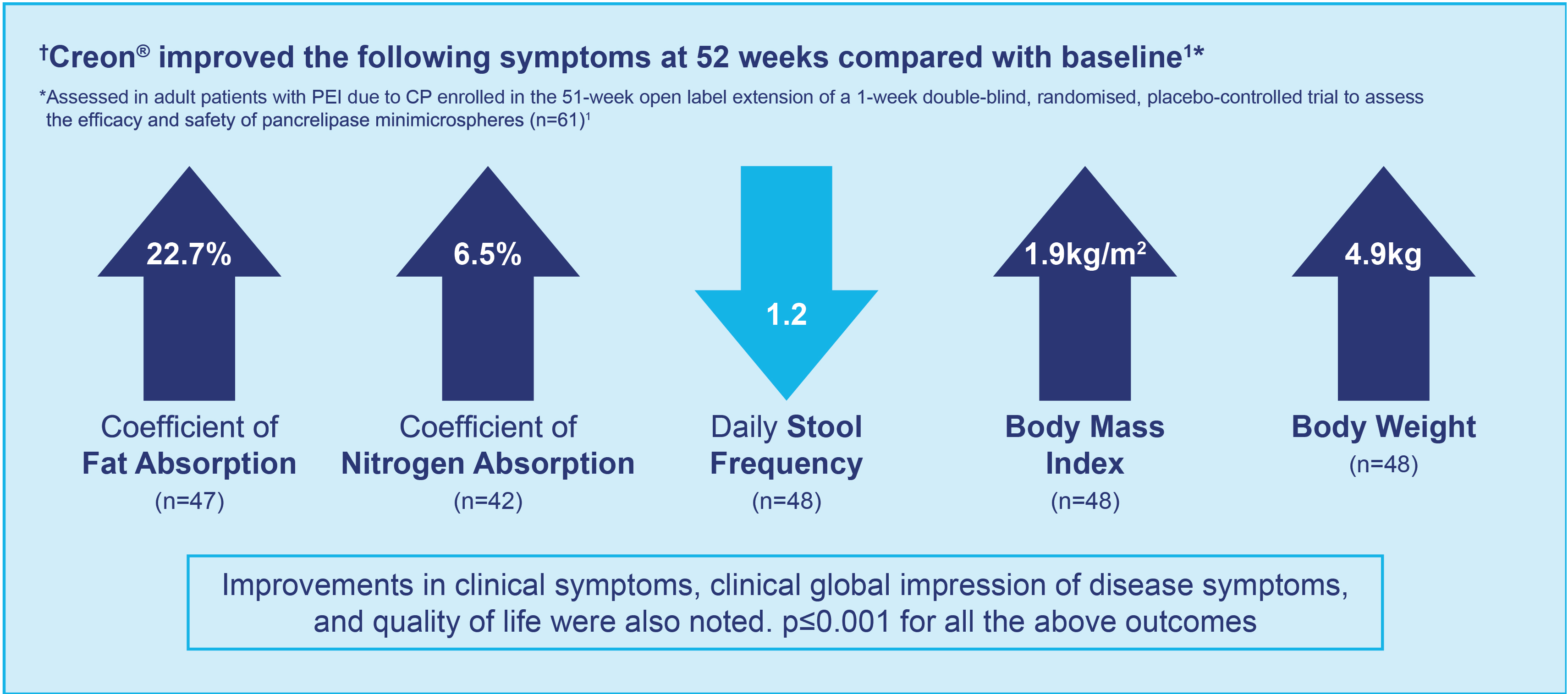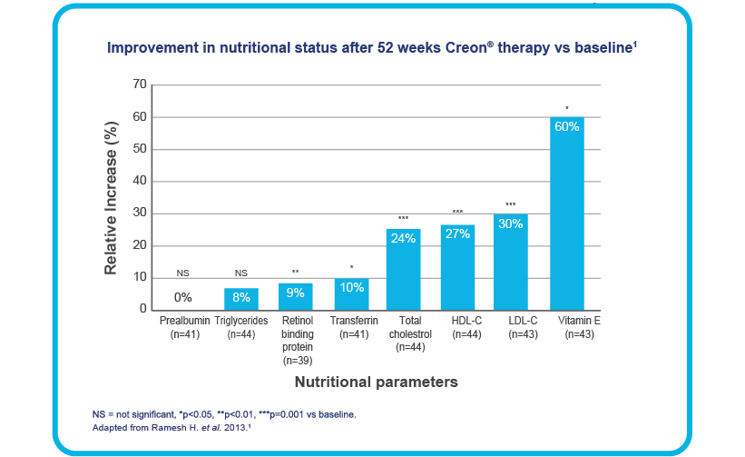 Creon® is effective and well-tolerated in patients with PEI, significantly improving patients' long-term nutritional status.1, 2