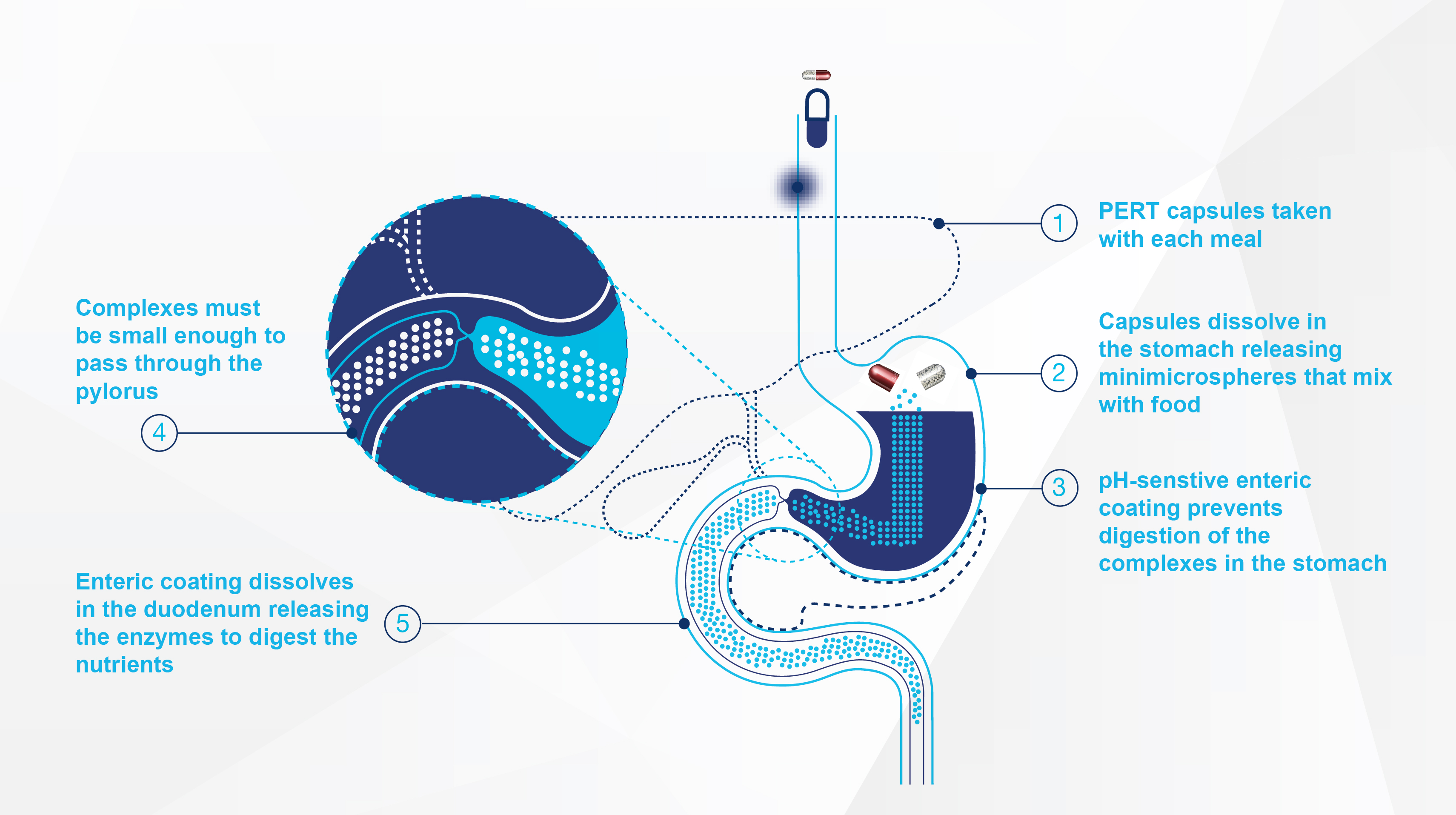 The pH-sensitive enteric coating prevents gastric acid from denaturing the lipase.4 Once the intact enzymes reach the alkaline pH of the duodenum, the enteric coating rapidly dissolves to release the enzymes into the lumen.5